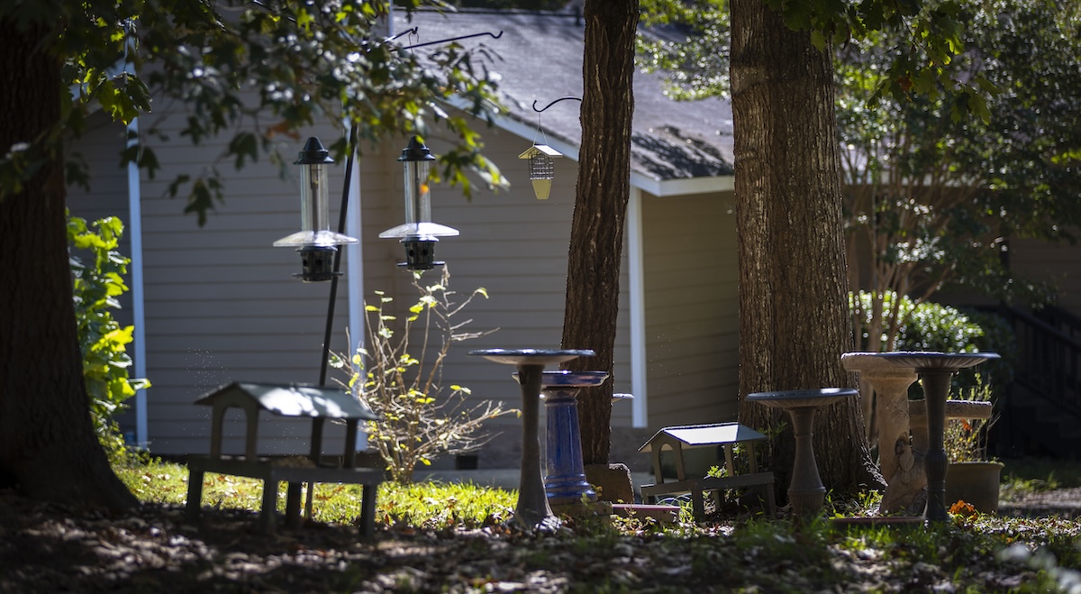 Photo at top: Platform feeders full of a tree nut blend, bird baths with water and overhead feeders decorate Kaya Manson’s front yard in Trotter Ridge. Photo by Dhruv Rungta – The 9th Street Journal